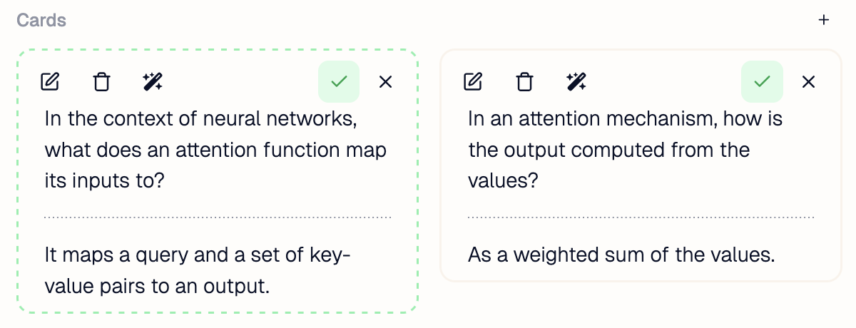 Since the flashcard writer and refiner can run in the background, the cards in a saved highlight might change since the last time you inspected it. Unseen cards have a dashed green border while seen cards have a regular muted border. Editing the card, or navigating away from the highlight will mark the card as seen.